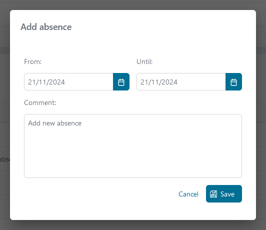 Menu entry Absences provides you with an absence management component. Here you can enter your absence and define delegate for tasks assigned to you or one of the roles you hold.