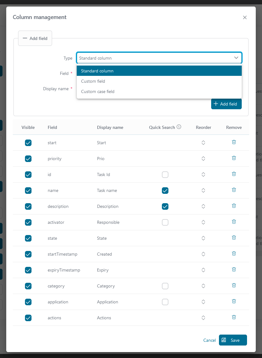 STRINGorTEXT.Quick search is enabled for the standard field name and description by default.