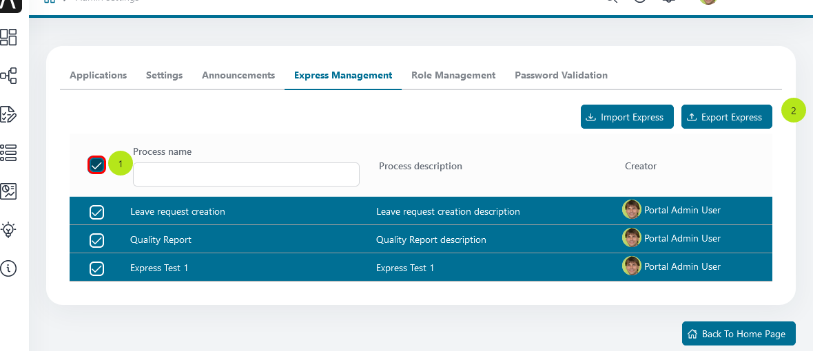 Select the workflows you want to export in Express workflows table. The selected workflows will be exported to a JSON file.