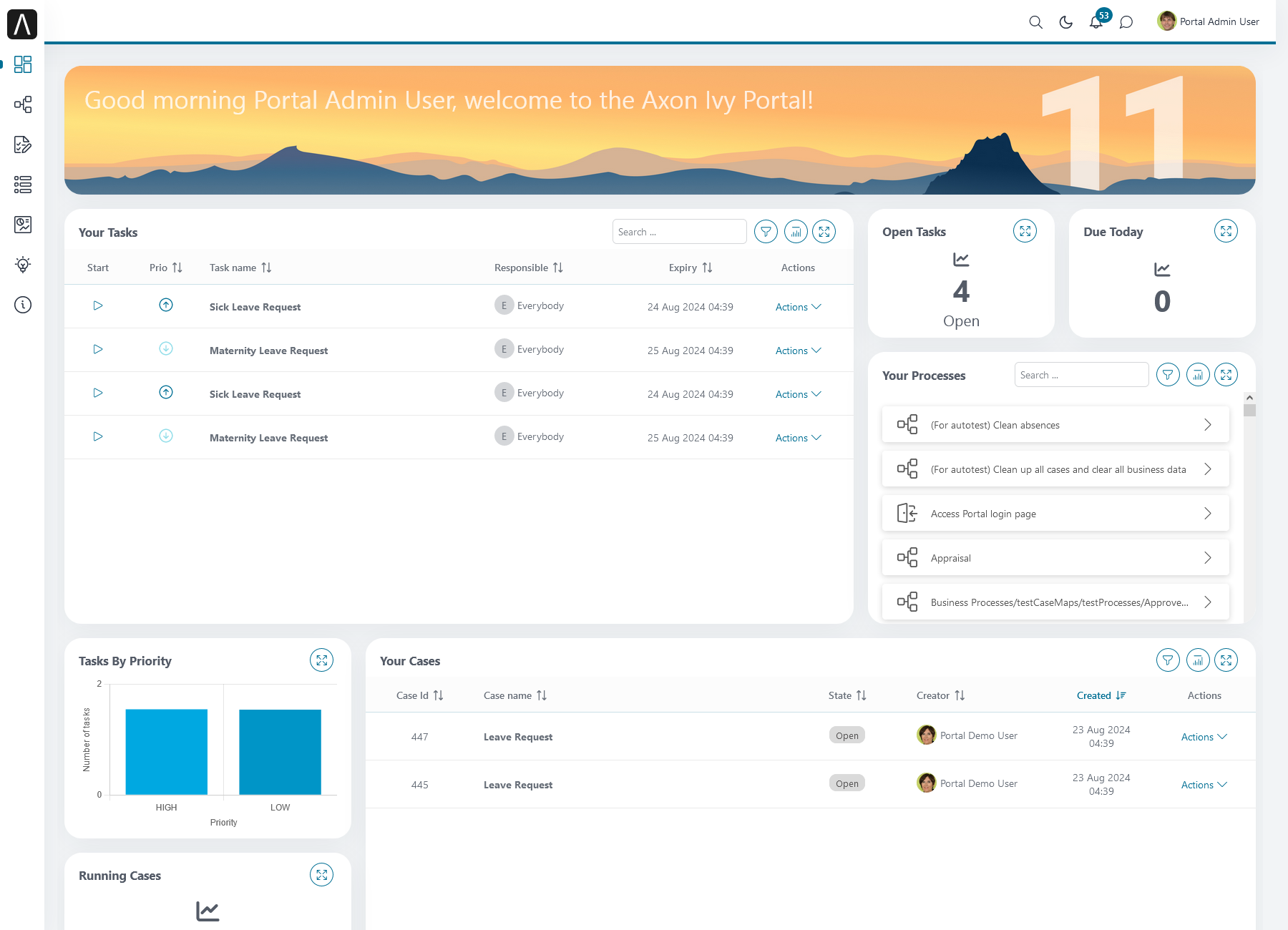 The Axon Ivy Portal Dashboard is the first page you encounter after successful login. You can always get back to the dashboard using the Dashboard link in the Axon Ivy Portal navigation menu. Alternatively, you can click on the logo image at the top left of the header.