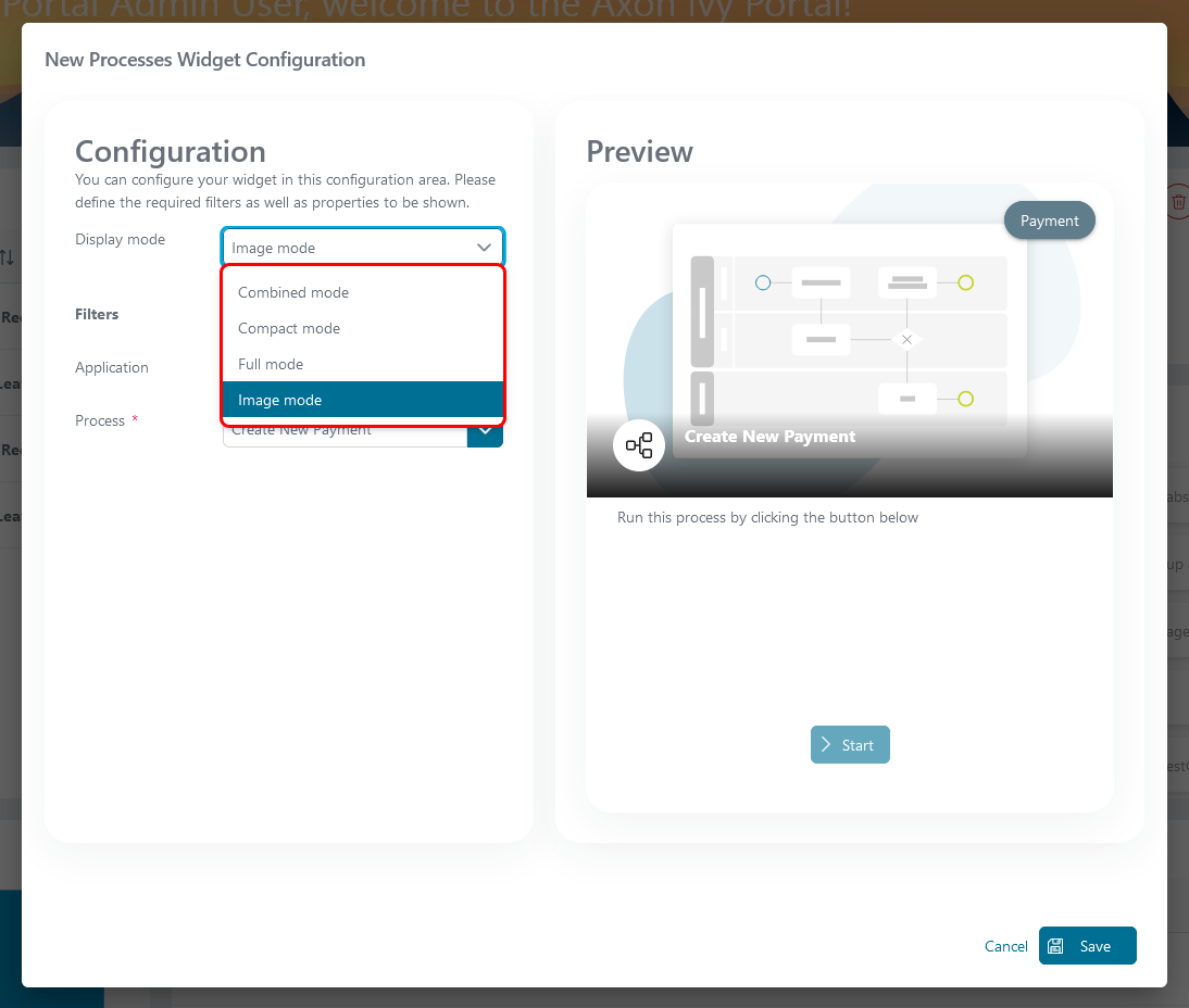 Process list widget: This widget displays available process starts. You can choose between different formats.