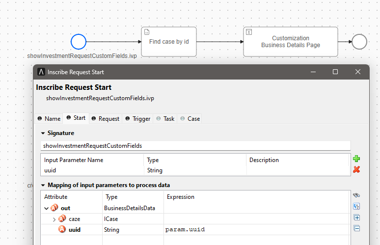 uuidparameter. When theBusiness detailsbutton on the case details page is clicked, Portal will call this process and pass the case UUID as theuuidparameter. Design and implement the user interface for the business details page within this process.