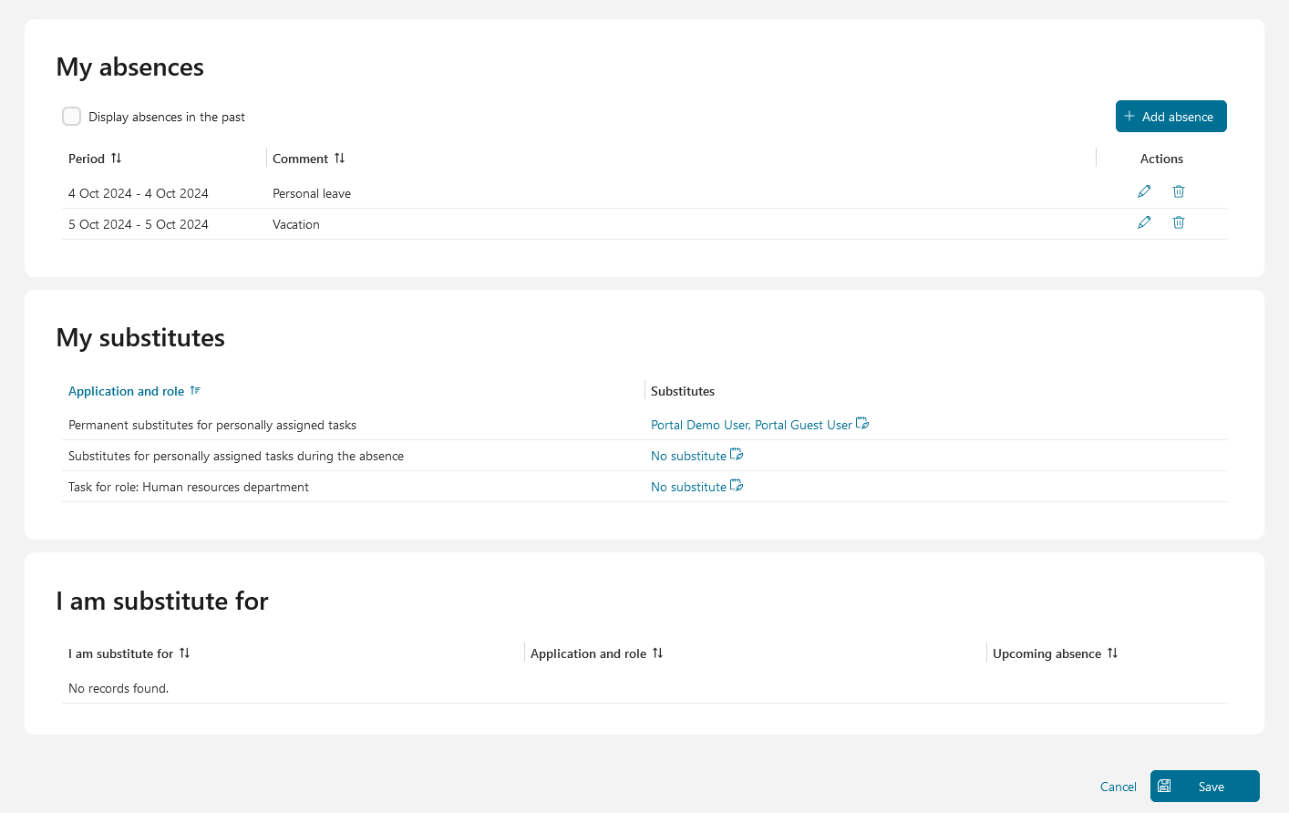 Menu entry Absences provides you with an absence management component. Here you can enter your absence and define delegate for tasks assigned to you or one of the roles you hold.