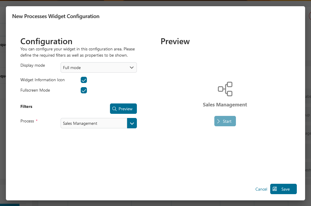 This widget displays a list of all selected process starts. You can sort your processes by index, alphabetical order or custom order. You can change your custom order by drag and drop the processes and enable quick search by selecting the quick search checkbox.