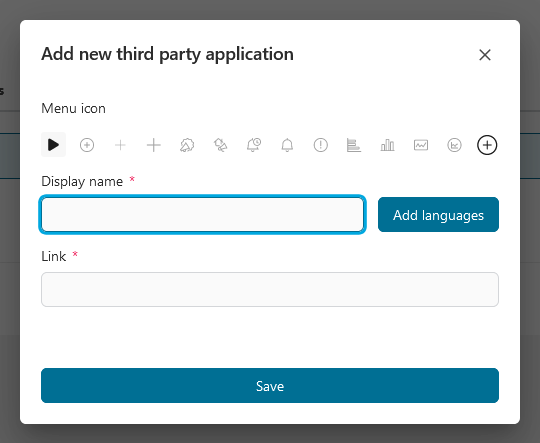 Click on New to add a new third party application. Dialog Add new third party application is displayed.