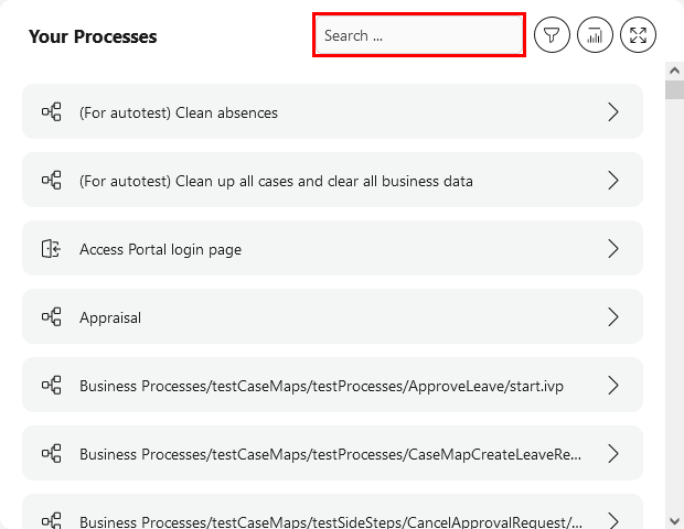 This widget displays a list of all selected process starts. You can sort your processes by index, alphabetical order or custom order. You can change your custom order by drag and drop the processes and enable quick search by selecting the quick search checkbox.