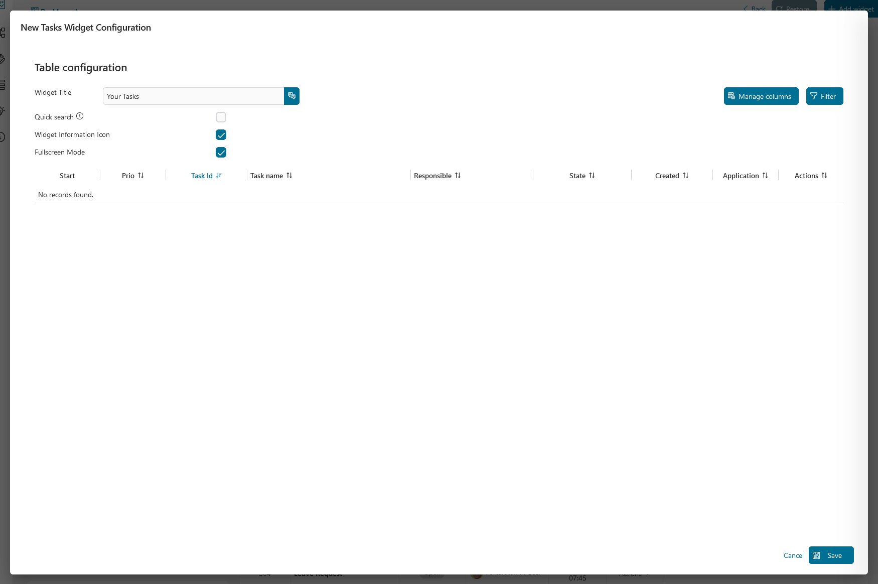 On the widget configuration panel, you can define the widget name, enable the quick search function, show or hide the widget information and fullscreen mode icons, manage columns and filters, edit the default sort order of the table columns by clicking on the column headers.