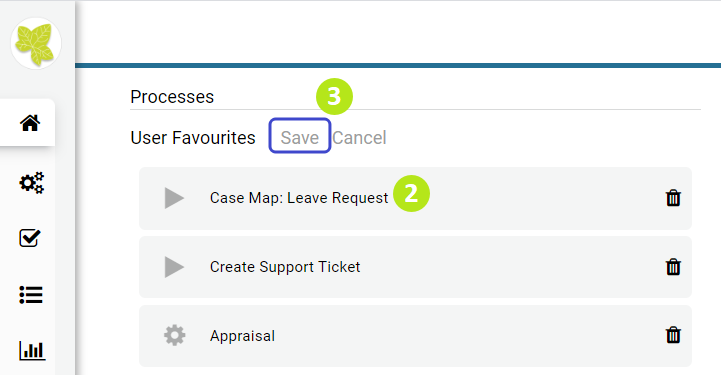 The Process favorites you find under the heading Processes on the left side of your dashboard. They provide you with a quick and easy access to the processes you need most in your daily work. Therefore, the process favorites are a key feature to enhance your Axon Ivy Portal experience and increase your efficiency. To make full use of this feature the Axon Ivy Portal offers you an easy way to configure the process favorites to your personal needs.
