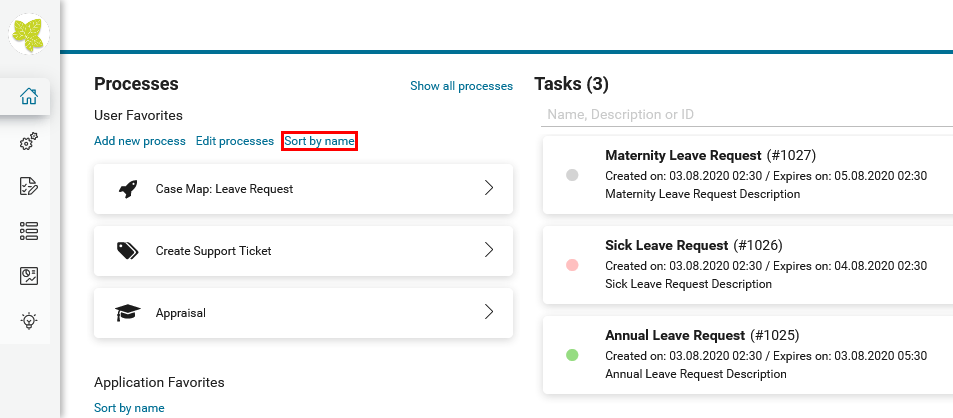 The Processes section on the left side. Here you find and manage quick links to the processes you use most often in your daily work. The section Processes is described in detail Process Favorites.