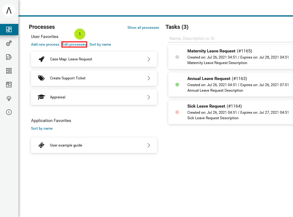 1. Manage quick links to the processes you use most often in your daily work. The section Processes is described in Process Favorites.