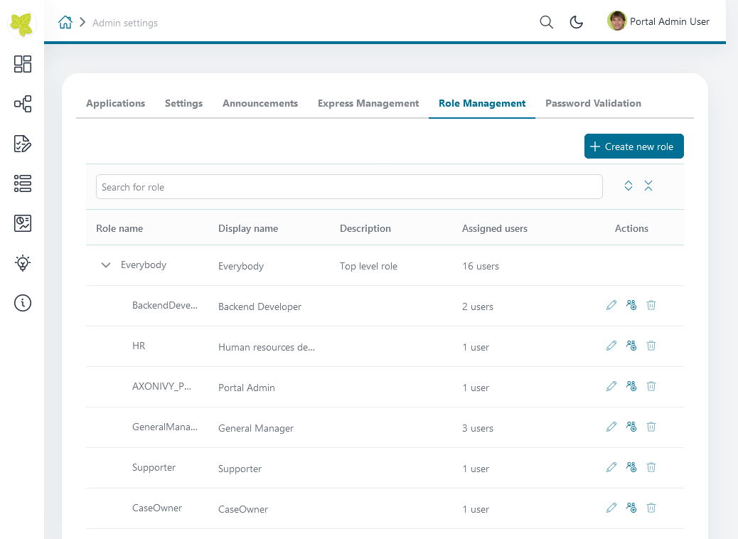 Portal provides the Role Management section in the Admin Settings area, where the user can manage roles.